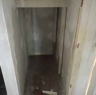 The first thing to do was to clear out the space. I found a brand-new fan, unboxed...from the 90s, plus other wares that I didn't really need. Left inside was a plywood shelf, held up with what seemed to be old scrap lumber. I cleared all of that out and assessed what next steps to take. Because I was adding drawers, I wanted to close off the space neatly, prime, and paint.